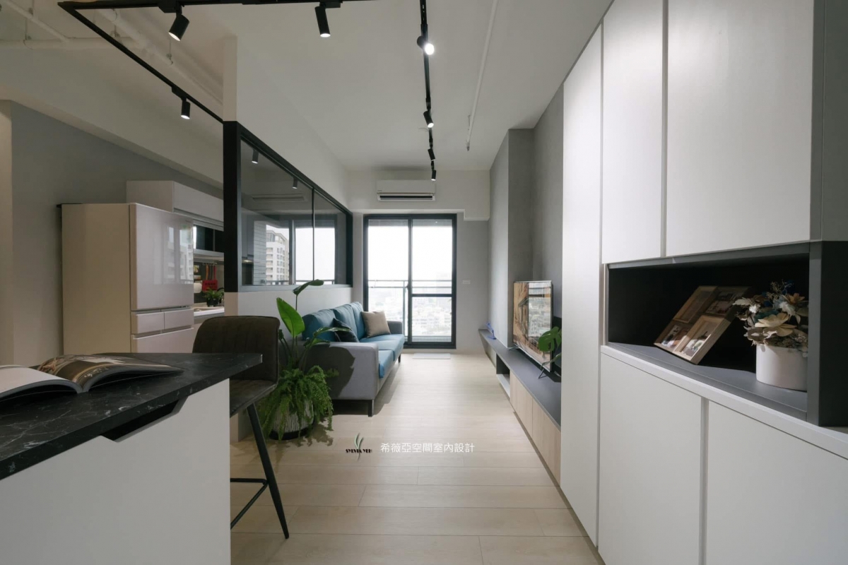 灰白基調搭配溫潤木地板,再透過黑框玻璃劃分場域,簡潔卻不單調。